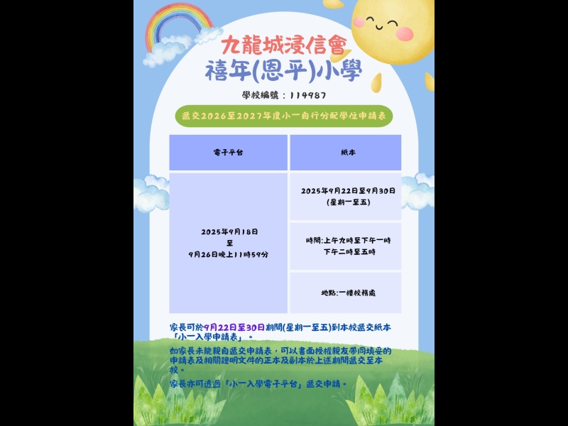 22/09/2025申請2026至2027年度小一自行分配學位